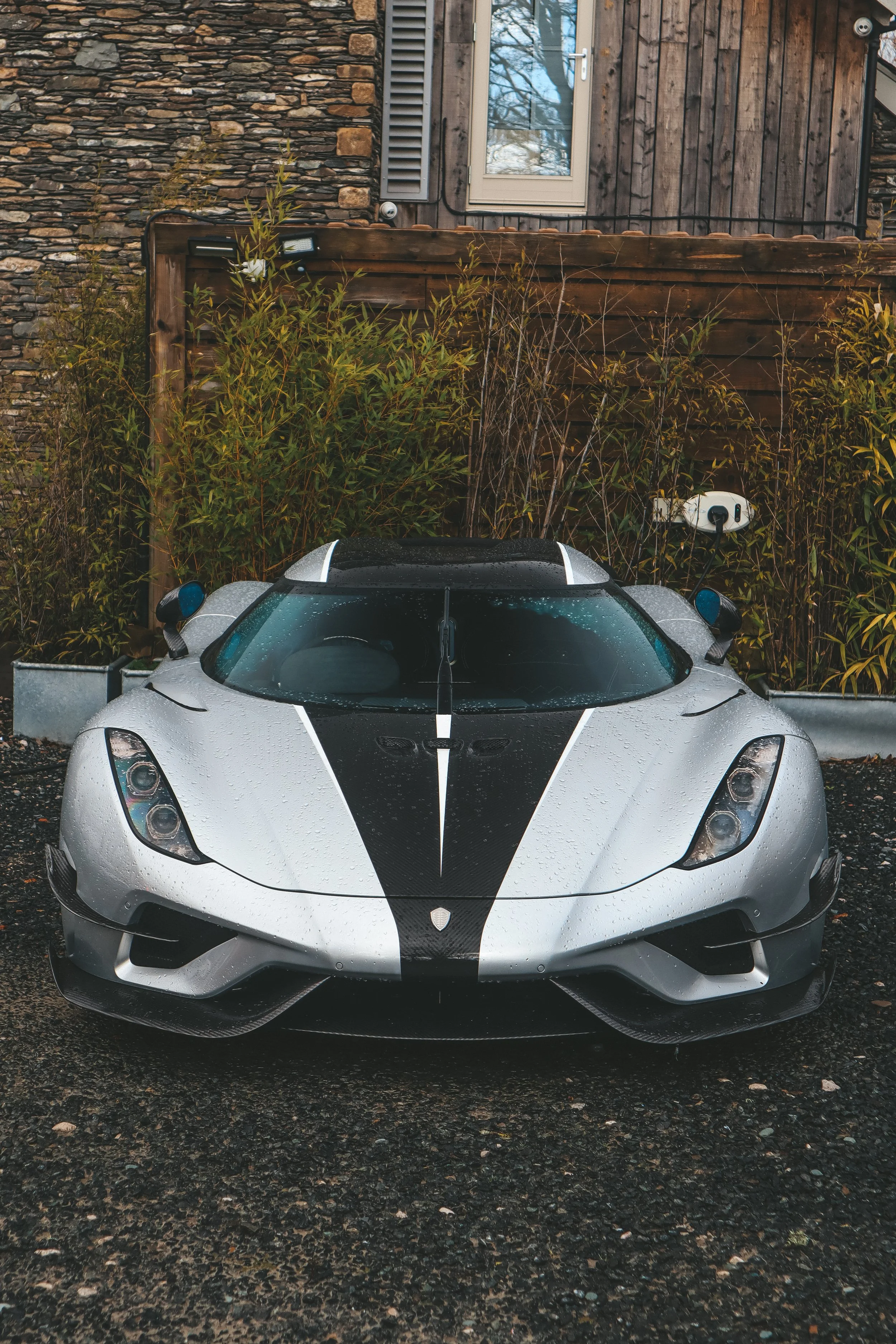 This Regera is painted in Moon Silver and has an Exposed Carbon centre section featuring a tapered Crystal White stripe down the centre and on each side. This carbon-and-white pairing is continued with a stripe down each side of the car. This car is optioned with the Ghost Package, giving it added carbon fins on the front, side skirts, and rear of the vehicle. The rear wing as well as wing mirrors are exposed carbon fibre. This car was optioned with the Tresex AirCore Carbon wheels and has black brake calipers.