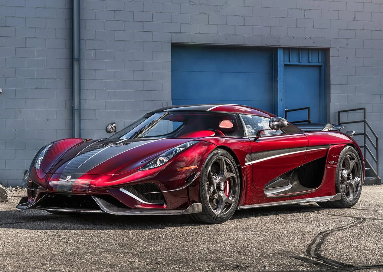 The exterior of this Regera is Candy Apple Red Carbon Fibre with an Exposed Carbon centre section and Moon Silver accents and striping. There is a Moon Silver stripe down the centre of the hood and a silver stripe on each edge of the carbon centre that run the length of the car. There is Moon Silver striping down each side of the car and Moon Silver accents on the front of the car bordering the air intakes. This car features the Ghost Package, hence the carbon aerodynamic fins on the front, sides, and rear of the car. The wheels are the Tresex AirCore wheels and the brake calipers are Apple Red. The brake calipers have “Koenigsegg” written on them in white.